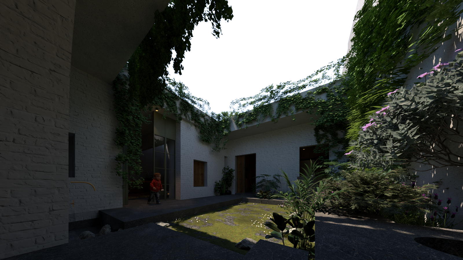 El patio central se convierte en un elemento protagonista que articula e interactúa de manera única con cada área de la casa, mientras que el patio trasero permite la ventilación cruzada e ilumina tanto las zonas privadas como las áreas comunes.